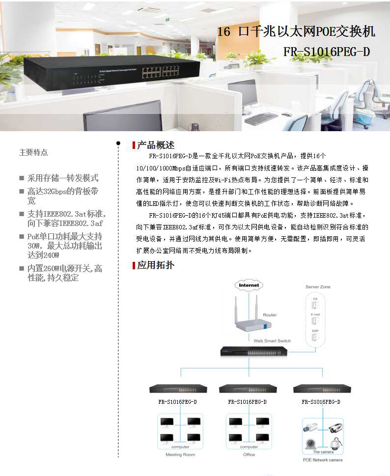 16个10/100/1000Mbps自适应RJ45端口(Auto MDI/MDIX)