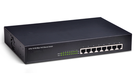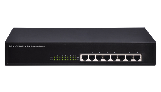 8个10/100M 自适应RJ45端口,1~8端口支持PoE供电;