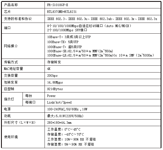 - 8个10/100/1000M自适应RJ45端口,支持自动翻转功能(Auto MDI/MDIX);