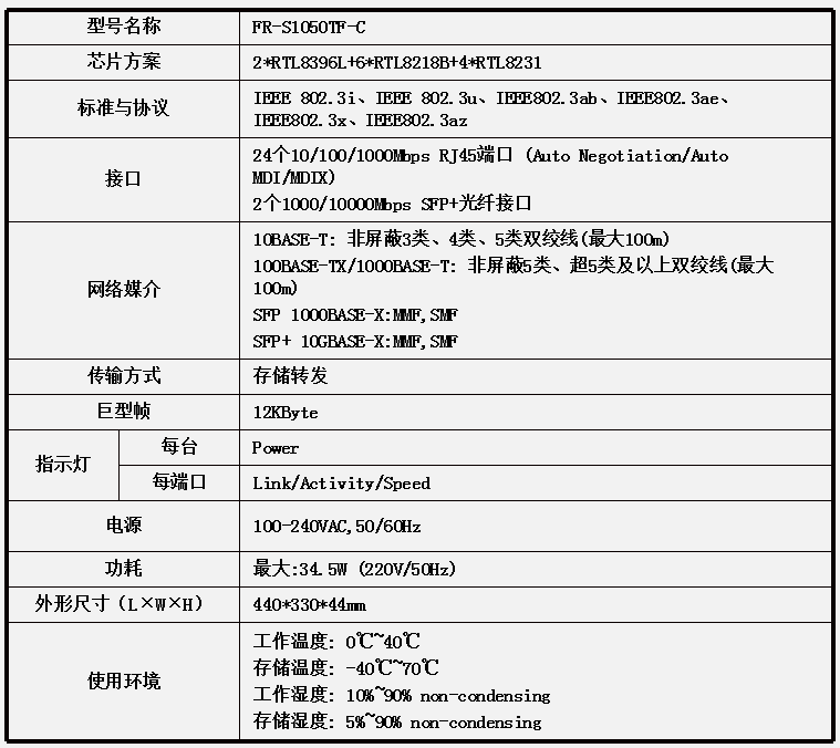 - 符合IEEE802.3i、IEEE802.3u 、IEEE802.3ab、IEEE802.3ae、IEEE802.3x、IEEE802.3az标准;