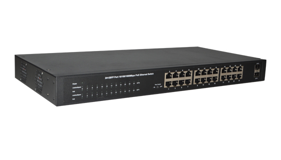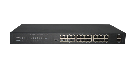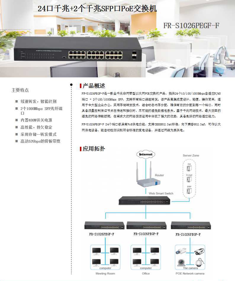 24个10/100/1000Mbps自适应RJ45端口(Auto MDI/MDIX) 2个100/1000Mbps SFP接口 1个流量控制开关