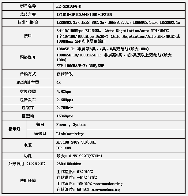 - 内置4K MAC地址表,支持MAC地址自学习;