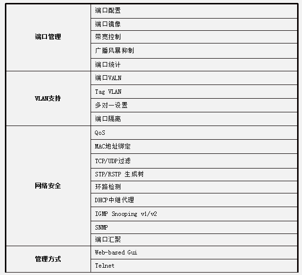 - 支持IGMP Snooping协议,有效缓解上层设备的转发压力;