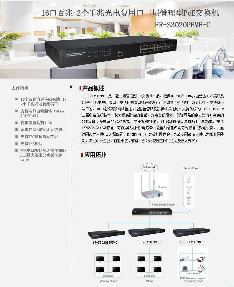 16个10/100Mbps自适应RJ45端口(Auto MDI/MDIX) 2 x 千兆Combo(RJ45/SFP)端口