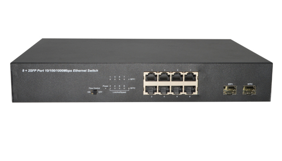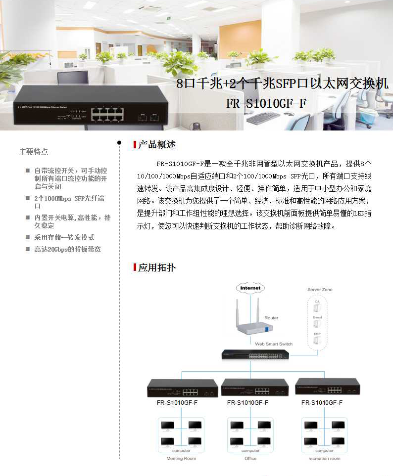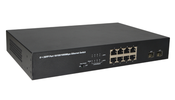 8个10/100/1000Mbps自适应RJ45端口(Auto MDI/MDIX) 2个100/1000Mbps SFP接口