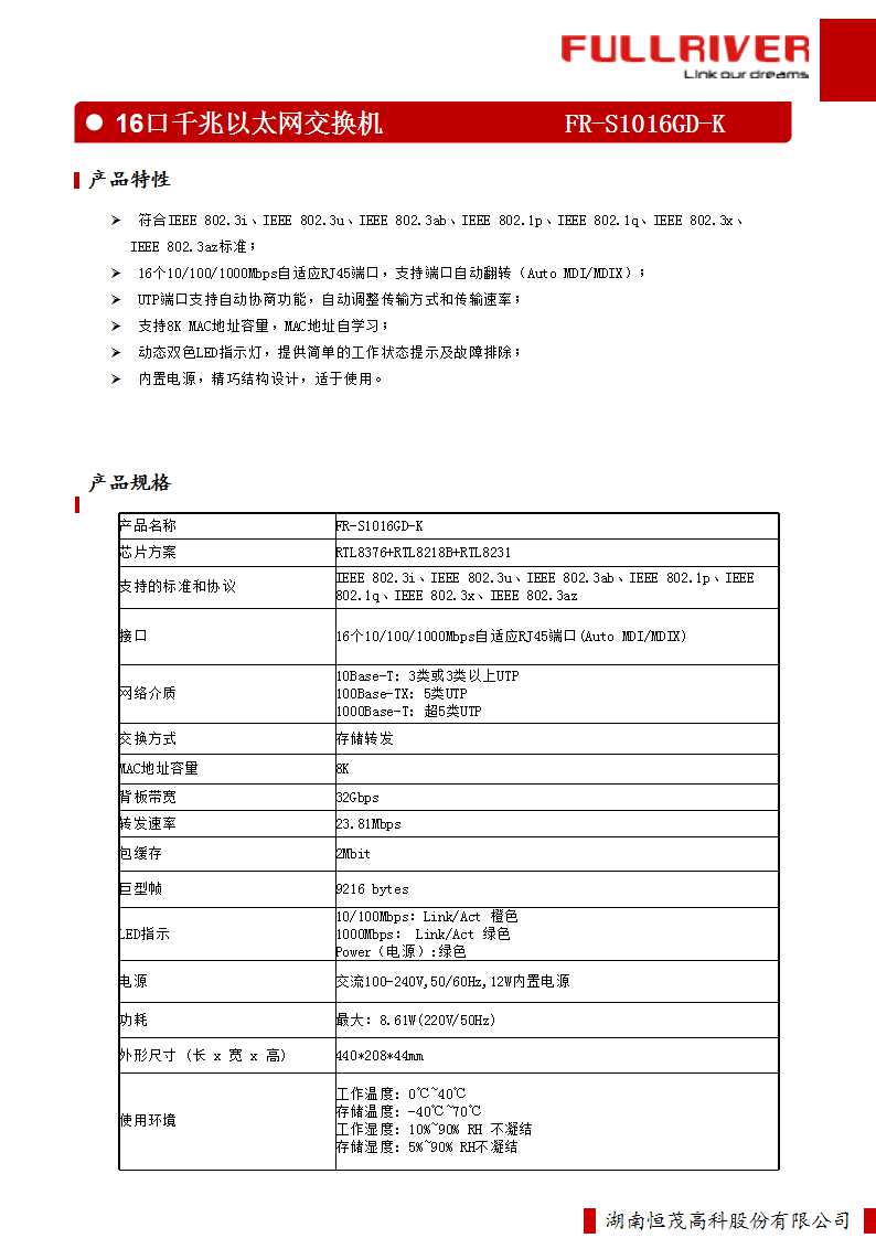 •  支持8K MAC地址容量,MAC地址自学习;