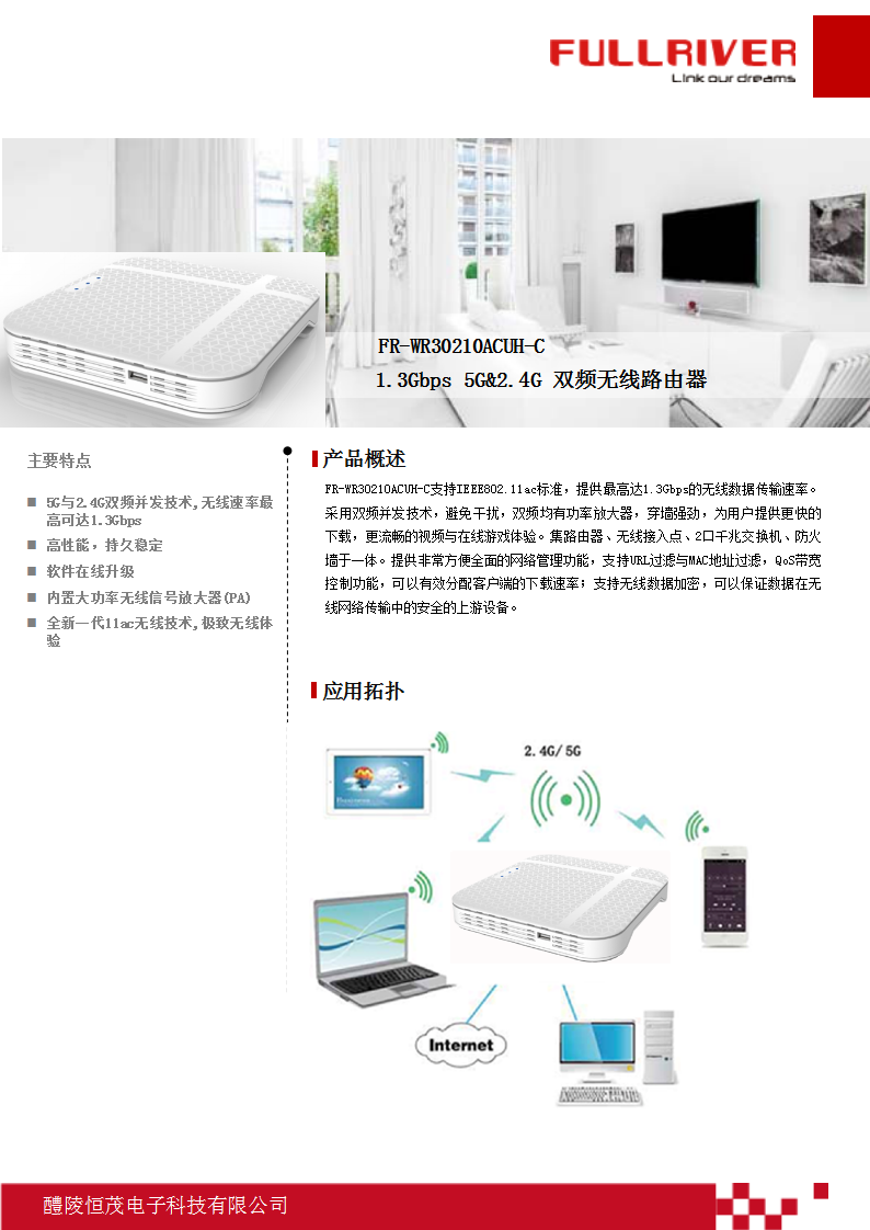 - 支持最高达1.3Gbps的无线传输速率,具备速率自适应功能,可以自动调整无线传输速率;