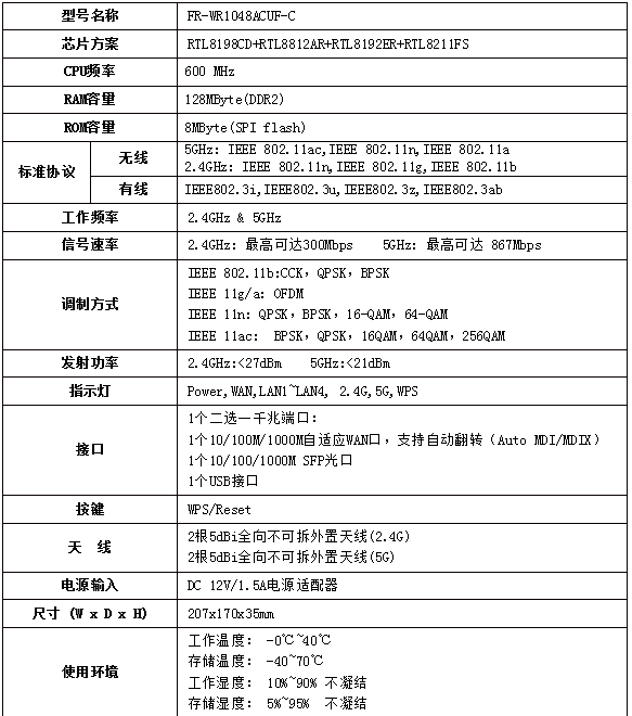 • 支持IEEE 802.11ac 、IEEE 802.11n、 IEEE 802.11g、 IEEE 802.11b、 IEEE 802.11a、IEEE 802.3ab 、 IEEE 802.3u 、IEEE 802.3标准;