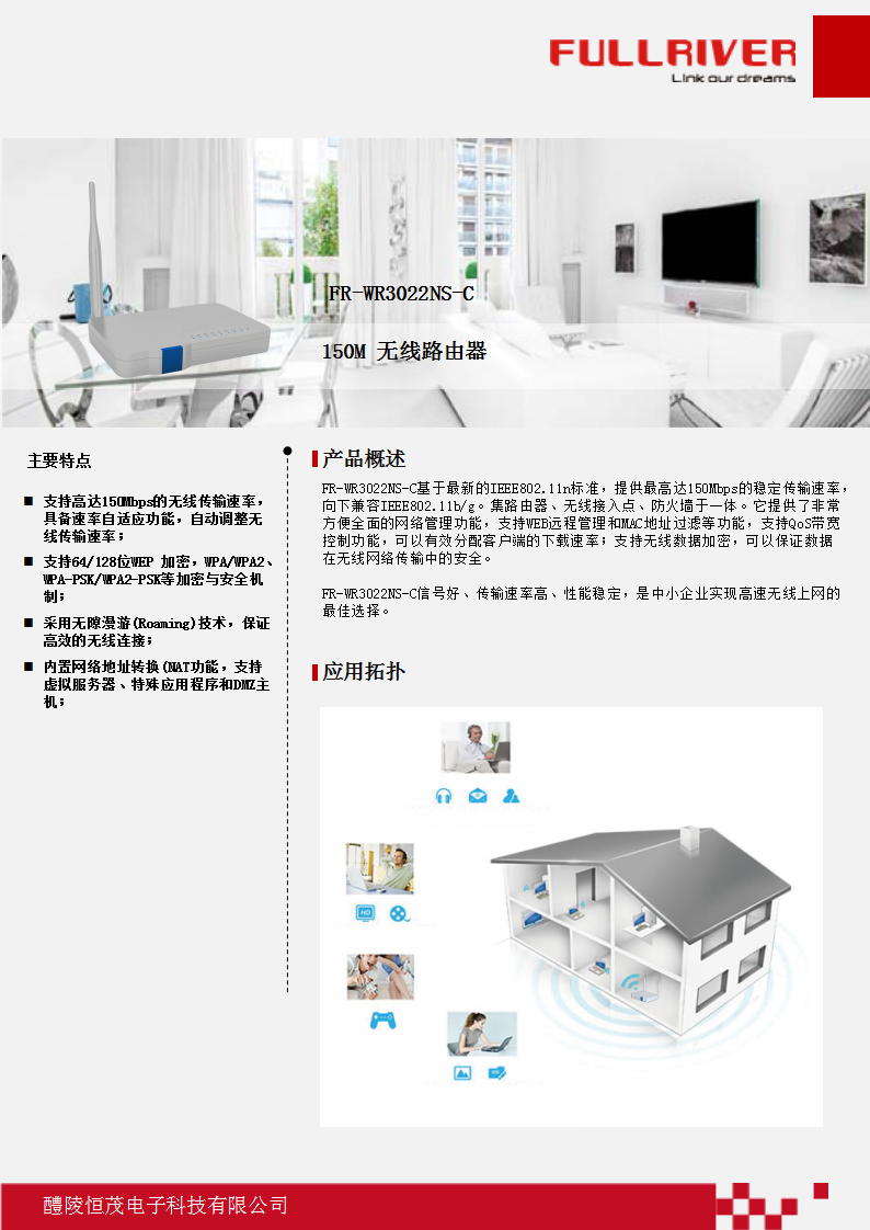 • 支持高达150Mbps的无线传输速率,具备速率自适应功能,自动调整无线传输速率;