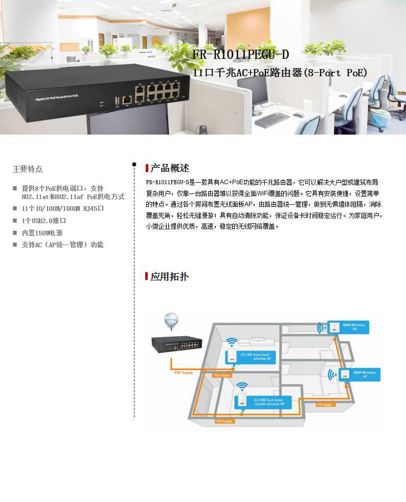 • 提供1个10/100/1000Mbps RJ45 WAN口、 10个10/100/1000Mbps RJ45 LAN口;