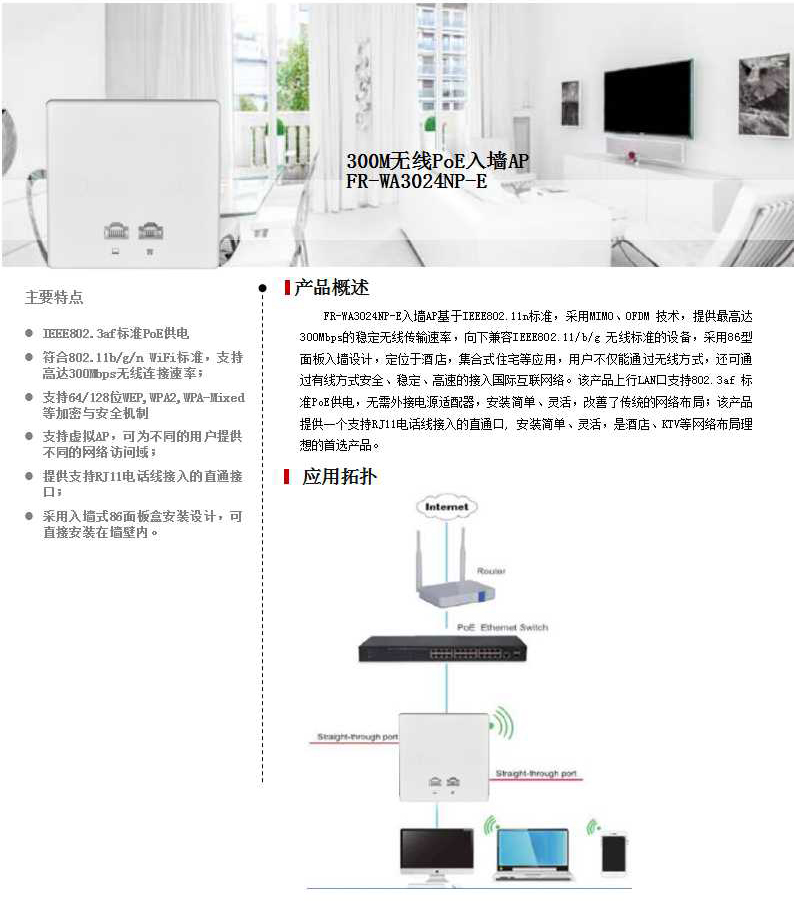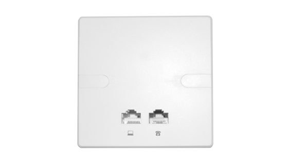 提供一个10/100Mbps RJ45上行LAN接口和一个10/100Mbps RJ45下行LAN接口,入墙上行LAN口支持802.3af标准PoE供电;