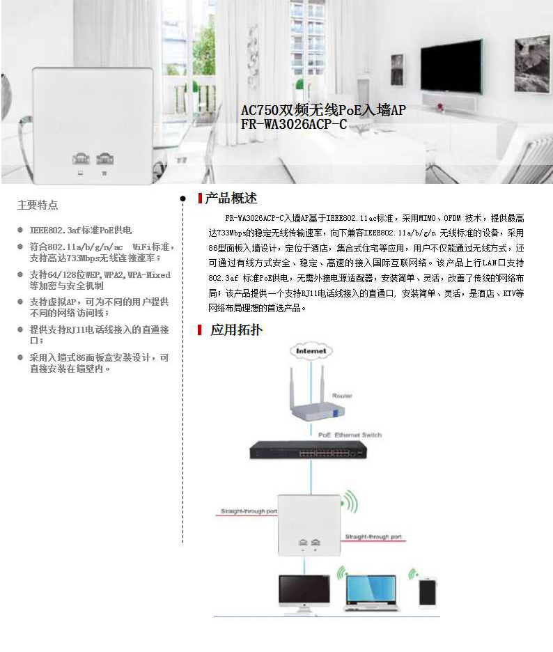 一个10/100Mbps RJ45上行LAN接口,支持802.3af标准PoE供电; 一个10/100Mbps RJ45下行LAN接口; 1组支持RJ11接口接入的直通口